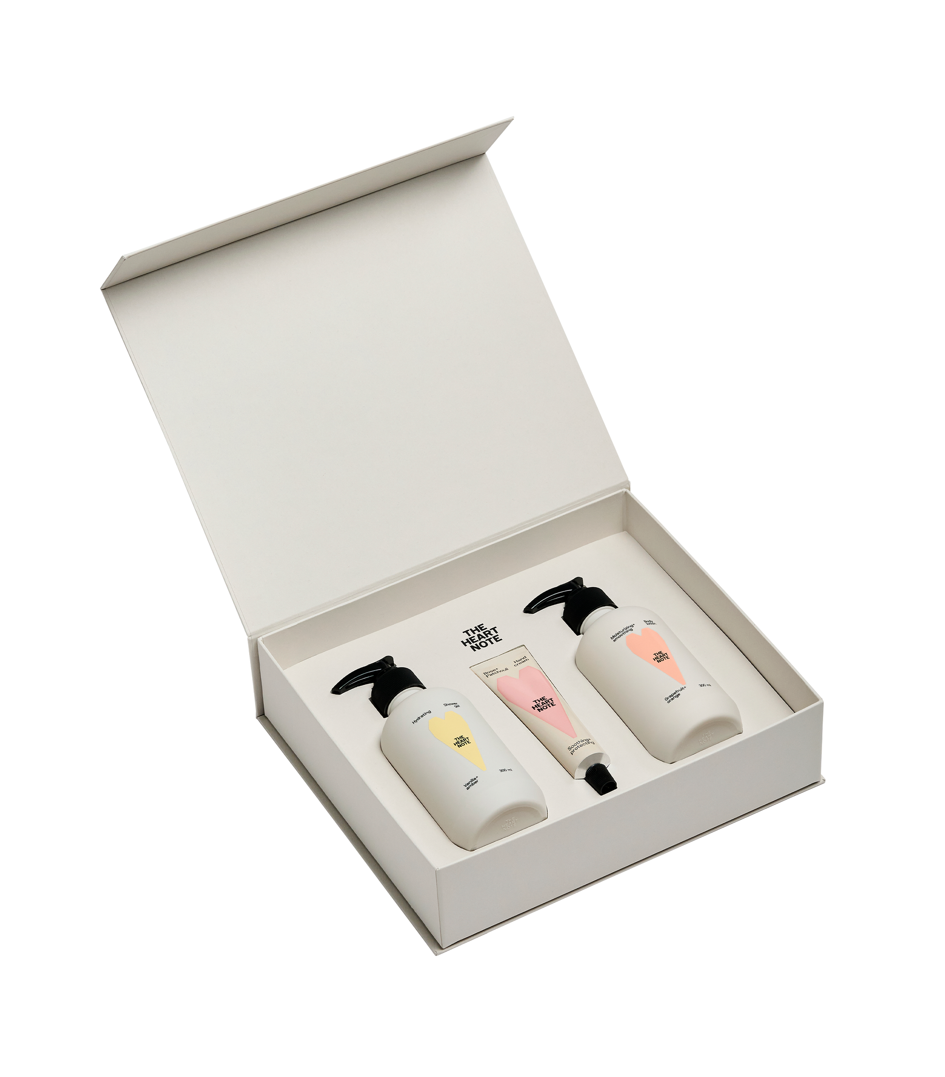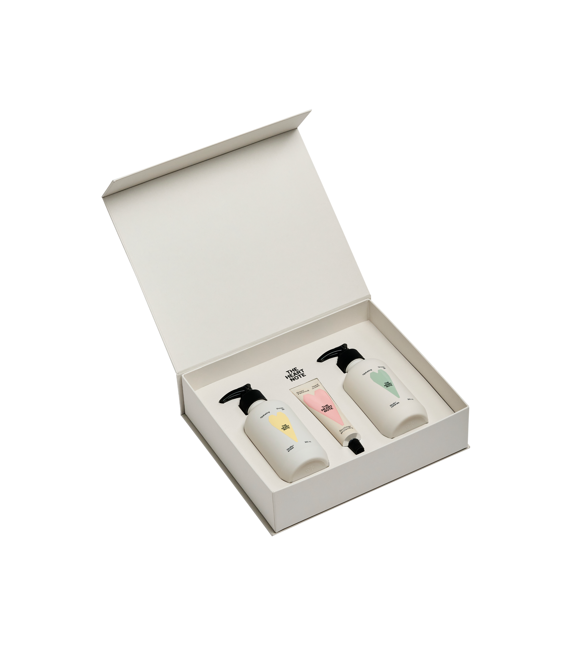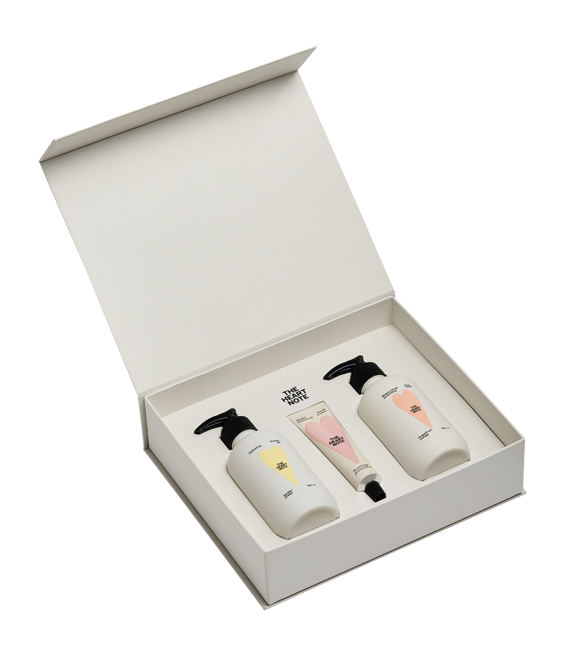 Подарунковий бокс містить три доглядові рішення THE HEART NOTE на вибір: крем для рук і два засоби по 300 мл.