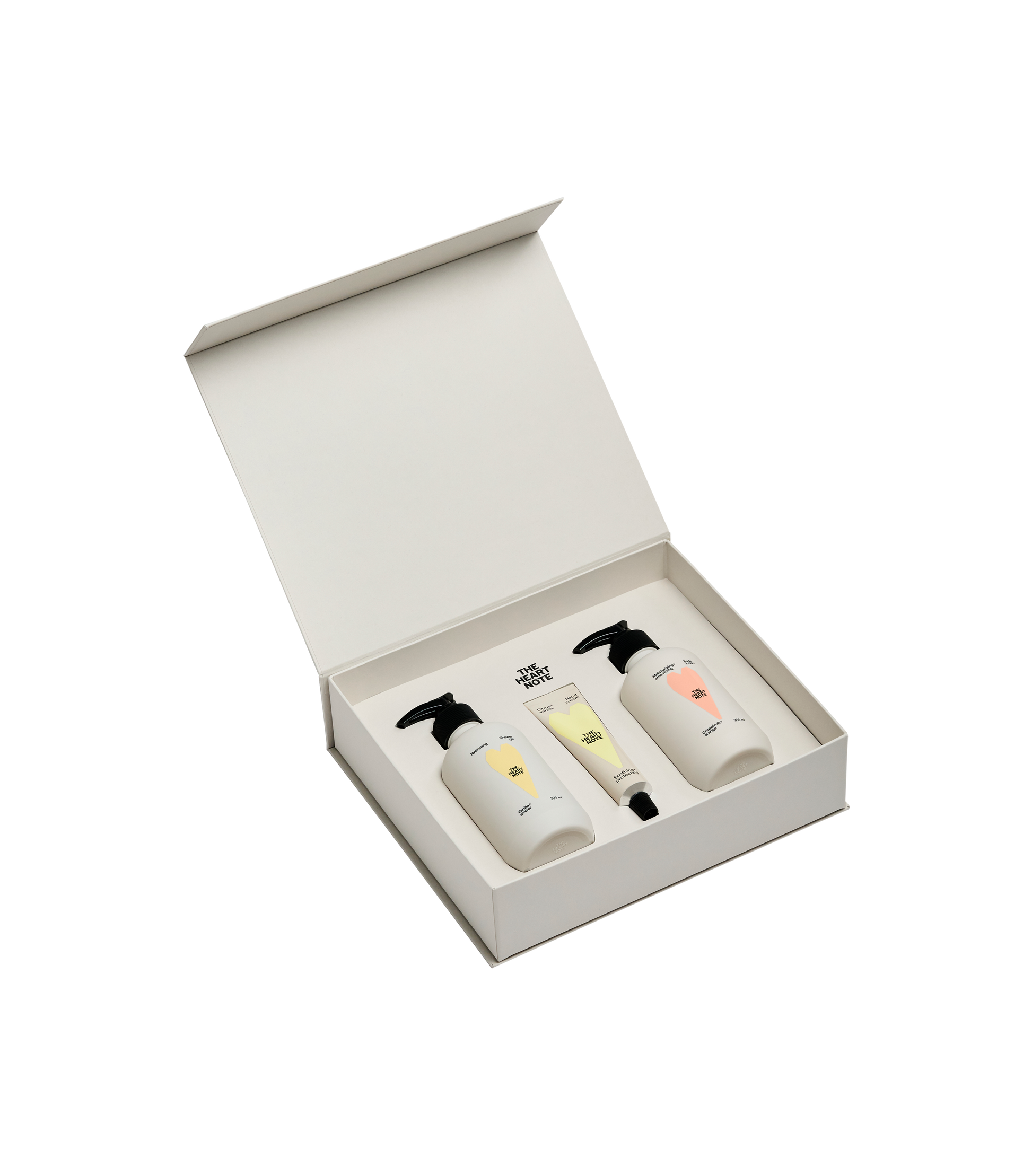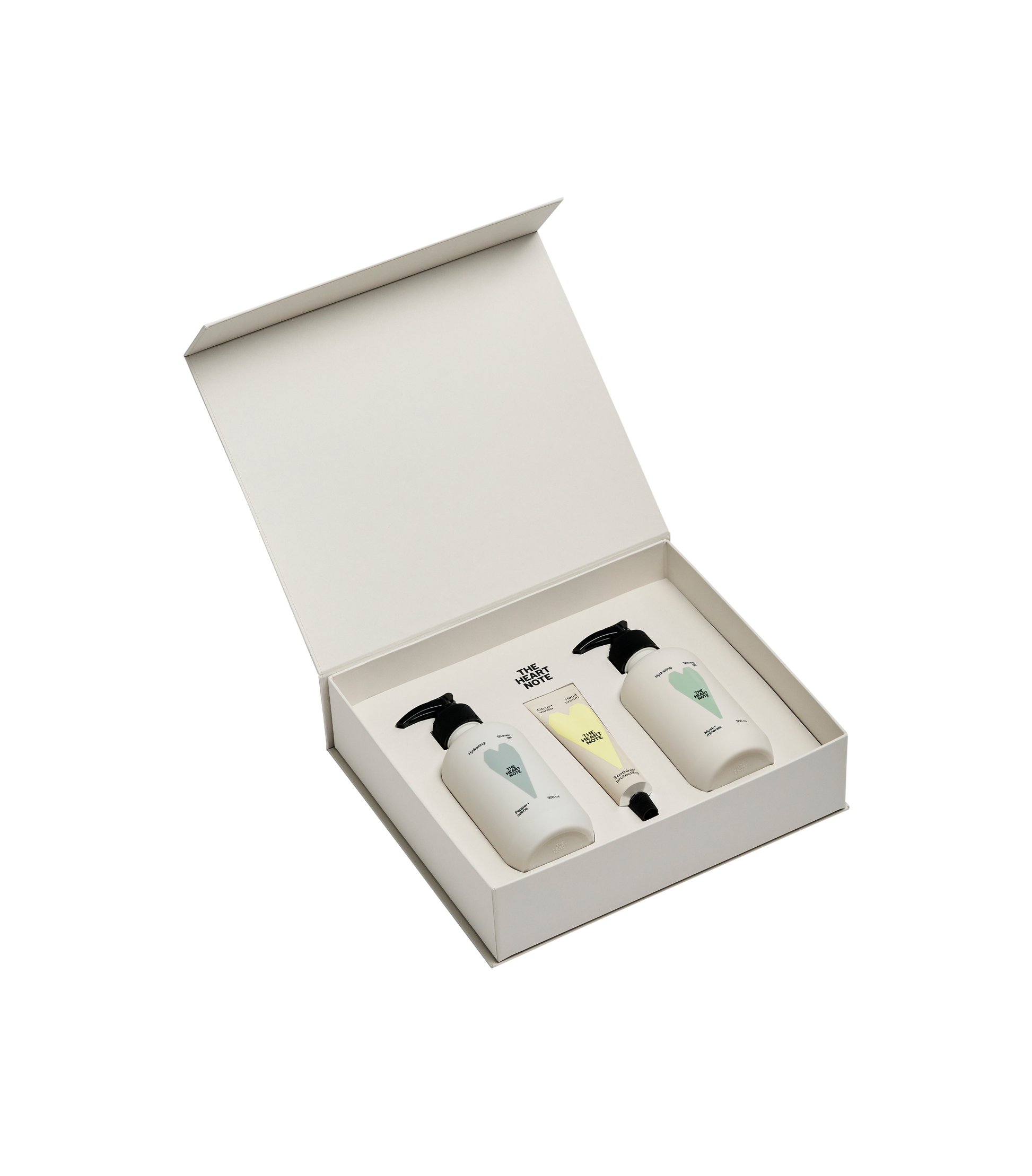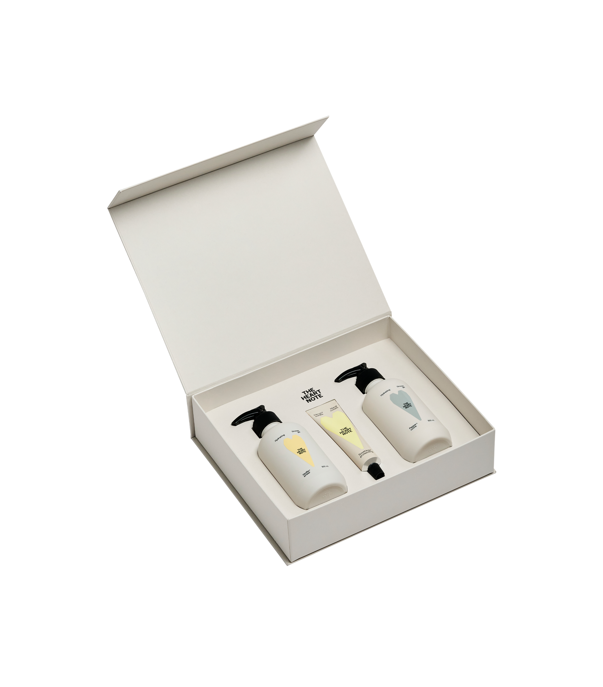 Подарунковий бокс містить три доглядові рішення THE HEART NOTE на вибір: крем для рук і два засоби по 300 мл.